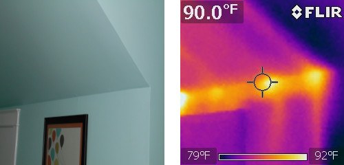 Bonus rooms generally have partially sloped walls/ceilings (dictated by the roofline) and a lot of knee walls. Knee walls are those with conditioned pace on one side and unconditioned space on the other. More often than not, knee walls cause several problems because the top and bottom plates are not properly air sealed. This allows super hot or cold air from the attic to flow into wall cavities when the HVAC system turns on. This hot or cold air then radiates out or seeps out through electrical outlets as well as gaps or holes in trim/molding.