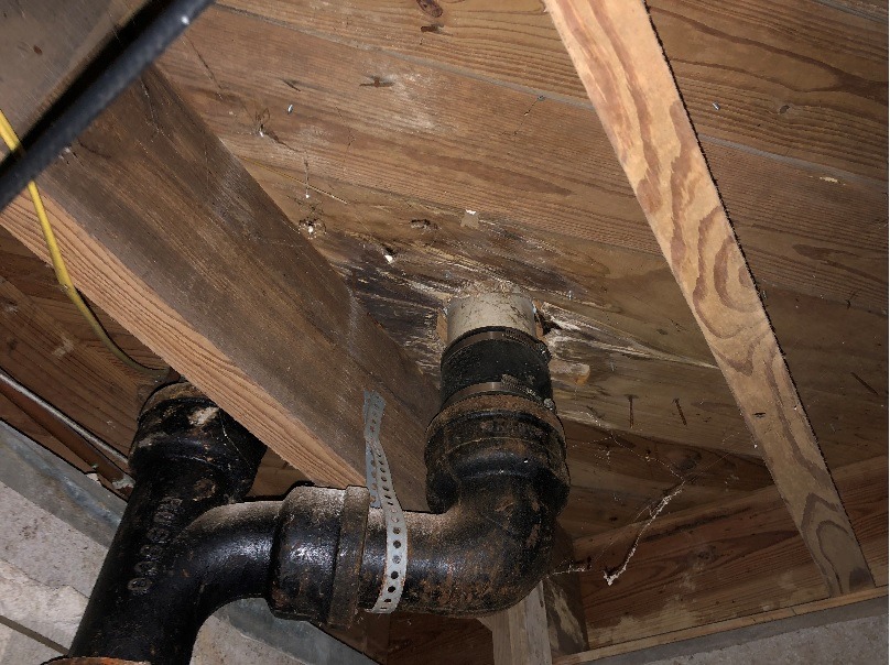 A simple, visual inspection can confirm a home needs more insulation. In attics, the “floor” (or ceiling joists for rooms below) should be well blanketed – generally enough to cover the joists. In the top image, some original insulation still exists but has settled over time. Other areas have no insulation at all. It was most likely moved when homeowners installed the can light fixtures. However, none was added back after that project. For a non-encapsulated basement or crawlspace, insulation should be visible on the ceiling (or “subfloor”). The second image shows a subfloor without insulation. One can also see the hole cut for the pipe has gaps around it allowing air to infiltrate conditioned space.